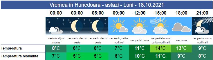Luni, săptămâna debutează cu temperaturi sub medie. Soarele va răsări la ora 07:46. În această noapte se va instala ceața pe arii extinse, iar pe timpul zilei soarele va fi învelit între nori. Atmosfera se va încălzi cu un grad-două față de ziua precedentă, în timp ce vântul va sufla slab și moderat. Spre seară norii vor domina cerul. Soarele va apune la ora 18:40. Temperaturile minime vor fi cuprinse între 5 și 8 grade, iar cele maxime între 12 și 14 grade.