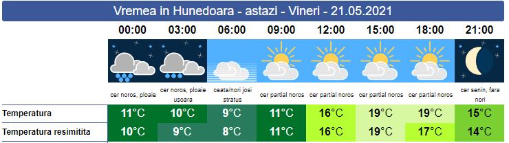 Vineri, vremea dă semne de îndreptare. Soarele va răsări la ora 05:49. În cursul nopții dintre joi spre vineri vor mai cădea ploi locale. Dimineața se va semnala ceața sau se va așterne un strat de nori joși. Peste zi, cerul va deveni parțial noros, iar temperaturile cresc ușor. Soarele va apune la ora 21:00. Valorile minime vor fi cuprinse între 9 și 11 grade, iar cele maxime între 16 și 19 grade.