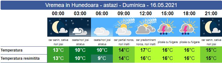 Duminică, se întrevede cer variabil mai mult noros. Soarele răsare la ora 05:52. Dacă ieri, ploaia ne-a ocolit, astăzi meteorologii susțin că cerul va fi acoperit cu nori pe tot parcursul zilei, iar spre a doua parte a zile, vor apărea precipitațiile însoțite de fenomene electrice și intensificări ale vântului. Posibil ca dimineață să se semnaleze ceața. Soarele va apune la ora 20:54. Temperaturile vor scădea față de ziua precedentă, astfel că minimele vor fi cuprinse între 9 și 13 grade, iar maximele în jurul valorii de 17 grade.