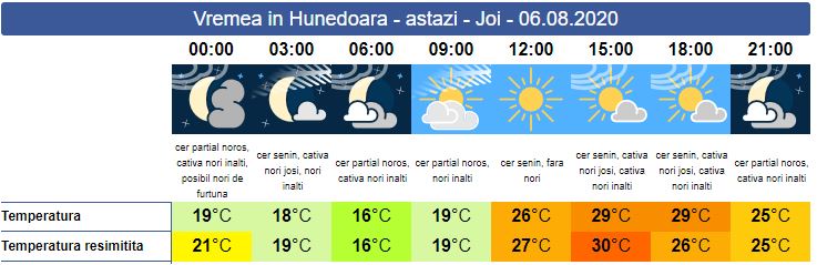 Vineri, vremea rămâne în general, însorită și călduroasă. Soarele răsare la ora 06:17. Temperaturile vor fi ridicate, iar disconfortul termic va atinge pragul de 80 de unități. În a doua parte a zilei, se va înnora treptat, însă șansele de ploaie sunt minime. Vântul va sufla slab spre moderat. Soarele apune la ora 20:50. Temperatura maximă resimțită se va fi de 30 de grade.