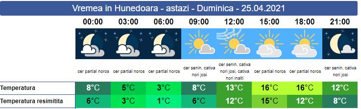 Duminică, se anunță o zi frumoasă. Soarele răsare la ora 06:24. Temperaturile vor crește față de ziua precedentă, dar în general, temperaturile rămân sub media datei din calendar. Cerul va fi mai mult senin, iar vântul va sufla slab și moderat, cu unele intensificări la munte, unde la rafală va depăși temporar 60-70km/h. Soarele va apune la ora 20:28. Valorile minime se vor încadra între 3 și 5 grade, iar maximele între 13 și 16 grade.