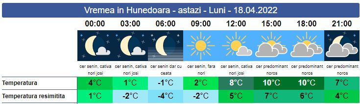 Luni, temperaturile se situează sub normalul termic din această perioadă. Soarele răsare la ora 06:36. Noaptea cerul va fi mai mult senin spre variabil, cu temperaturi ce vor coborî sub pragul înghețului, în zonele deluroase și la munte. Peste zi, atmosfera va fi parțial senină, iar spre amiaza se va înnora accentuat și local vor cădea precipitații mixte. La munte va ninge, iar vântul va sufla cu putere. Soarele va apune la ora 20:19. Maximele nu vor urca mai mult de 10-11 grade.
