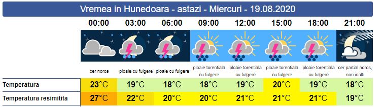 Miercuri, în zona noastră, până spre orele amiezii se menține codul portocaliu de instabilitate accentuată. Soarele răsare la ora 06:32. Atât pe timpul nopții cât și în cursul zile de miercuri se așteptă ploi și fenomene violente. Temperaturile vor scădea considerabil față de ziua precedentă. În unele zone vor cădea ploi abundente, însoțite de descărcări electrice. Cantitățile de apă pot ajunge între 50-70 l /mp. Vântul va sufla tare și se vor forma condiții de vijelii și grindină. Soarele apune la ora 20:31. Temperatura maximă se va resimții în jurul valorii de 21 de grade.
