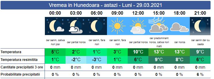 Luni, vom avea parte de o atmosferă plăcută. Soarele răsare la ora 07:13. Local, de dimineață, se va semnala ceața, iar în depresiuni vor fi condiții de brumă. Peste zi, vremea e schimbătoare. Vântul va sufla slab spre moderat cu unele intensificări la munte. Soarele va apune la ora 19:53. Valorile termice se vor încadra între 1 și 3 grade, iar maxima zilei în jurul valorii de 13 grade.