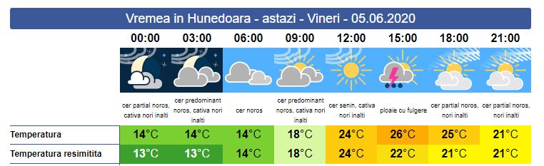 Vineri, în zona noastră, ziua se anunță cu instabilitate atmosferică. Soarele va răsări la ora 05:38. Ca aspect, ziua de azi e asemănătoare cu ziua precedentă, doar că valorile termice sunt mai ridicate. Pe alocuri, pe spații restrânse se vor înregistra ploi ce pot fi însoțite de descărcări electrice și grindină, iar cantitățile de apă vor fi însemnate. Vântul va bate moderat cu intensificări mai ales în zonele montane. Soarele apune la ora 21:15. Valorile minime ale zilei se vor încadra între 14 și 18 grade, iar valoarea maximă va urca până la 26 de grade.