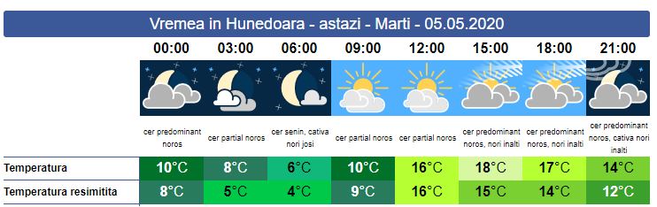 Marți, vremea se va încălzi ușor față de ziua precedentă. Soarele răsare la ora 06:07. Astăzi, soarele își va face apariția, dar norii vor domina cerul. Izolat se vor înregistra ploi, descărcări electrice, iar cantitățile de apă pot fi însemnate. În zona montană înaltă, precipitațiile vor fi mixte, iar vântul va prezenta unele intensificări. Soarele va apune la ora 20:42. Temperaturile minime se vor încadra între 6 și 10 grade, iar cele maxime între 14 și 18 grade, însă se vor resimți mai reci ca în termometre.