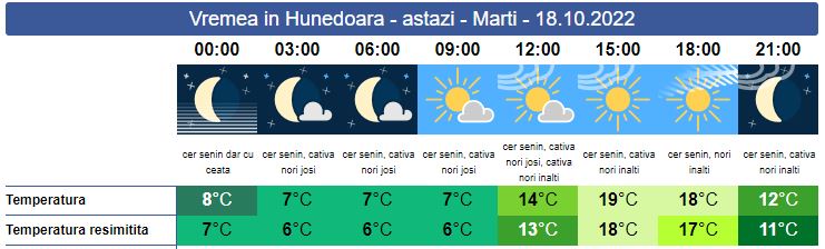 Marți, ziua va fi însorită. Soarele va răsări la ora 07:46. Ceața va fi prezentă pe timpul nopții și dimineață. Peste zi, cerul se va însenina treptat, iar soarele va încălzi atmosfera. Vântul nu va pune probleme. Soarele va apune la ora 18:40. Temperaturile maxime vor fi ușor mai ridicate față de ziua precedentă, astfel că, maximele vor urca în jurul valorii de 20 de grade. Minimele vor fi cuprinse între 5 și 8 grade.