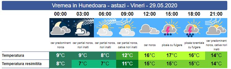 Vineri, în zona noastră, vremea se menține la fel ca în ziua precedentă. Soarele răsare la ora 05:41. Dimineața e răcoare și se vor semnala înnorări temporare. În a doua parte a zilei își vor face apariția norii grei de ploaie. Aversele vor avea și caracter torențial și frecvente descărcări electrice. Local vor fi cantități de apă mai însemnate și izolat posibil să cadă grindina. Vântul va avea intensificări de scurtă durată în timpul ploilor și la munte. Soarele apune la ora 21:09. Temperaturile minime se vor încadra între 9 și 12 grade, iar maxima zilei se va situa în jurul valori de 17 grade.