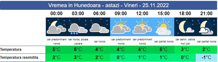 Vineri, ploile se vor restrânge. Soarele răsare la ora 07:39. Local, la noapte va ploua slab, iar dimineață e posibil să se lase ceața prin unele zone. Peste zi cerul va fi variabil spre noros. Soarele va apune la ora 16:51. Temperaturile sunt în scădere, iar vântul va sufla cu intensificări la munte. Termicele se vor situa între 5 și 2 grade.