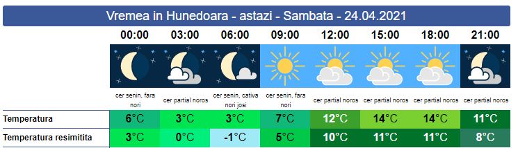 Sâmbătă, atmosfera va fi plăcută, dar cu valori termice sub media perioadei. Soarele răsare la ora 06:26. Local, dimineața și noapte se vor înregistra ceața și bruma. În zona noastră, vremea va fi în general frumoasă, în deosebi, în prima parte a zile. Norii și soarele vor împărți cerul, iar vântul va sufla slab și moderat cu intensificări temporare în zonele înalte. Soarele va apune la ora 20:27.
