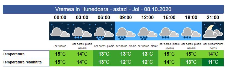 Joi, vreme de ploaie. Soarele răsare la ora 07:34. Codul galben de precipitații se menține pe teritoriul județului Hunedoara din seara zilei de miercuri și până spre amiaza zilei de joi. În tot acest timp vor cădea cantități importante de apă pe arii extinse, apoi va ploua local. Vântul va avea unele intensificări, iar în zona montană va sufla tare. Spre seară ploile se vor restrânge. Soarele apune la ora 18:36. Temperaturile minime și cele maxime vor fi în general apropiate, astfel în cât valoarea minima a zilei se va situa în jur de 13 grade, iar maxima în jurul valorii de 15 grade.