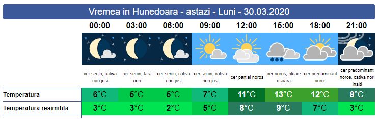 Luni, vremea se menține destul de plăcută pentru această perioadă. Soarele răsare la ora 07:11. Spre după-amiza zilei se va înnora treptat, și se vor înregistra precipitații sub formă de ploaie. La munte, în a doua parte a zilei vor domina ninsorile. Vântul va sufla slab și moderat, cu unele intensificări la munte. Soarele va apune la ora 19:55. Valorile minime se vor înregistra între 5 și 8 grade, iar maximele între 11 și 13 grade, dar se vor resimți mai scăzute.