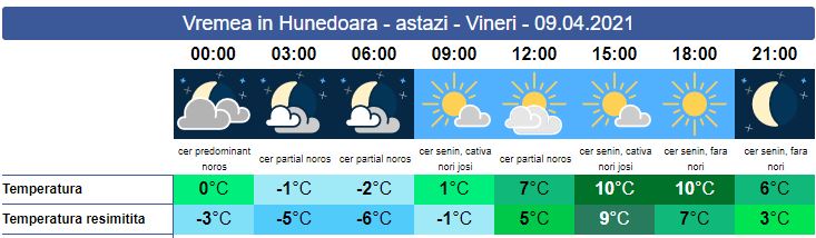 Vineri, temperaturile se mențin scăzute pentru prima decadă a lunii. Soarele răsare la ora 06:52. La noapte cerul va deveni variabil spre senin, iar valori termice vor fi negative. În zona montana înaltă va continua să ningă, iar vântul va spulbera zăpada. În general, pe timpul zilei soarele va fi prezent mai mult pe cer încălzind ușor atmosfera și va apune la ora 20:07. Minimele zilei vor fi cuprinse între 0 și -2 grade, iar maximele între și 10 grade.