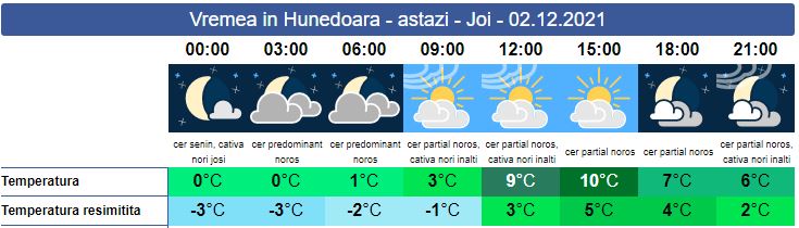 Joi, temperaturile sunt mai ridicate față de ziua precedentă. Soarele răsare la ora 07:47. Peste noapte cerul va fi mai mult senin, dar se va așterne ceața spre dimineață. Pe timpul zilei cerul va fi variabil și pe alocuri se vor semnala ploi, iar la munte va ninge. Vântul va sufla cu intensificări mai ales la munte. Soarele va apune la ora 16:47. Valorile minime se situează între 0 și 3 grade, iar cele maxime vor urca în jurul valorii de 7 și 10 grade.