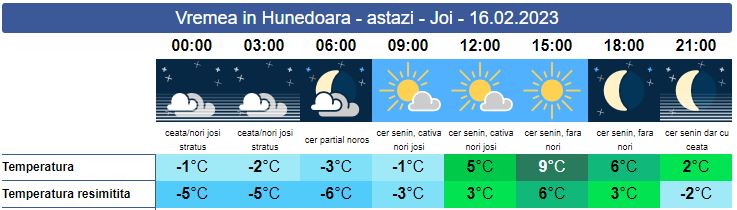 Joi, atmosfera va plăcută. Soarele răsare la ora 07:28. Atât pe timpul nopții, cât și peste zi temperaturile cresc și vor fi zone cu ceață. Peste zi cerul va fi variabil spre senin. Vântul va sufla slab la moderat. La munte vremea va fi însorită, iar vântul va sufla cu unele intensificări. Soarele va apune la ora 17:56. Valorile termice se vor situa între -3 și 9 grade.