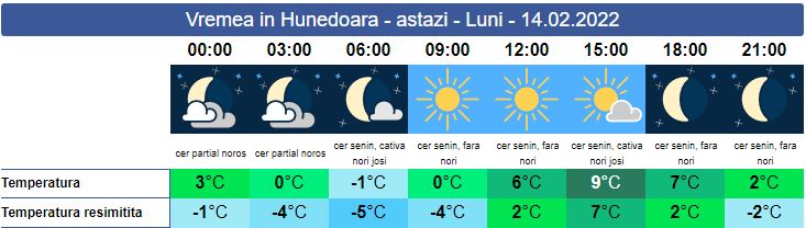 Luni, valorile termice vor fi ușor mai ridicate decât în mod normal pentru perioada din calendar. Soarele răsare la ora 07:31. Pe timpul nopții cerul este variabil, dar spre dimineață nori vor dispărea și temperaturile vor fi cu minus. De la primele ore ale dimineții și până spre seară soarele va sta nestingherit pe cerul senin și va apune la ora 17:54. Vântul va sufla slab spre moderat cu unele intensificări, în zonele de munte, iar pe spații restrânse se va semnala ceața. Valorile maxime se vor situa în jurul valorii de 12 grade.