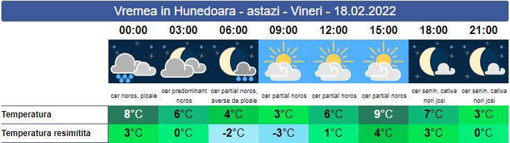 Vineri, cer temporar noros. Soarele răsare la ora, 17:24. În perioada de peste noapte se vor înregistra ploi ușoare, iar pe crestele Carpaților Meridionali, meteorologii au emis cod portocaliu de viscol puternic, zăpadă troienită și vizibilitate foarte scăzută. Intensificări ale vântului se vor semnala și în zonele joase de relief. Avertizarea va fi valabilă până la ora 11:00. Pe timpul zilei atmosfera va fi variabilă. Local se va lăsa ceața. Soarele apune la ora 17:59.