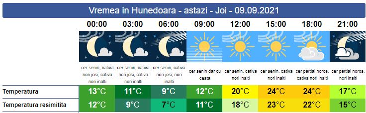Joi, soarele ne va bucura ziua și va răsări la ora 06:57. Noaptea și dimineața, temperaturile se mențin răcoroase, dar spre amiază acestea vor crește treptat, astfel încât maximele vor urca în jurul valorii de 24 de grade. Dimineață, în depresiuni se va lăsa ceața. Vântul va prezenta unele intensificări la munte. Valorile minime se vor situa între 9 și 11 grade.