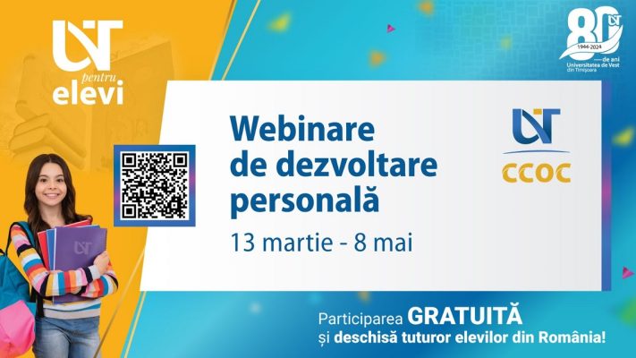 În următoarele săptămâni, prin organizarea Centrului de Consiliere și Orientare în Carieră (CCOC) din Universitatea de Vest din Timișoara (UVT) se va derula noua serie de webinare dedicate dezvoltării personale a elevilor, utile pentru orientarea viitoarelor opțiuni în legătură cu continuarea traseului lor educațional. Astfel, echipa Centrului de Consiliere și Orientare în Carieră din UVT vine în sprijinul elevilor și îi invită să participe la noua serie de webinare de dezvoltare personală, conform programului de mai jos:
