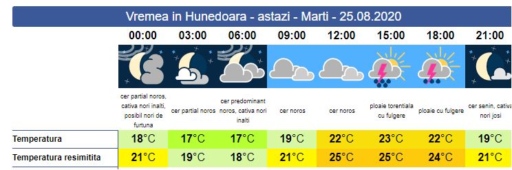 Pentru ziua de marți, meteorologii ne informează că suntem sub cod GALBEN de instabilitate temporar accentuată în peste 20 de județe printre ele aflându-se și județul Hunedoara. Soarele răsare la ora 06:38. Până la ora 23:00 suntem sub cod de avertizare. În zona noastră, se va răcori și vor cădea precipitații, în a doua parte a zilei. Se vor înregistra ploi torențiale însoțite de descărcări electrice, intensificări de scurtă durată ale vântului, iar pe arii restrânse se va forma grindina. Cantitățile de apă pot ajunge la peste 40 l/mp. Soarele apune la ora 20:20. Temperatura maximă se va resimți la 25 de grade.