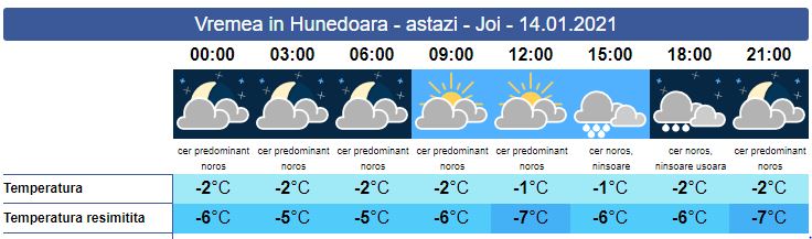 Joi, cerul va fi mai mult noros. Soarele răsare la ora 08:04. Regimul termic se încadrează în normalul perioadei. Meteorologii susțin că în zona noastră se vor înregistra precipitații sub formă de ninsoare, mai ales în zonele înalte. Vântul va sufla slab și moderat, cu unele intensificări la munte, iar rafalele vor viscoli zăpada determinând scăderea vizibilității. Soarele apune la ora 17 :10. Temperaturile zilei se vor situa în jurul valorii de -2 grade, dar se vor resimți mult mai reci.