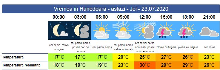 Joi, se anunță o zi cu mai multe fenomene meteo specifice zilelor de vară toride. Soarele răsare la ora 06:00. Peste zi cerul va fi variabil, iar temperaturile vor fi ușor mai scăzute față de ziua precedentă. Norii vor umbri soarele, iar din a doua parte a zilei e posibil ca pe alocuri să cadă averse însemnate cantitativ însoțite de descărcări electrice și grindină. Vântul va bate cu intensitate de scurtă durată. Soarele va apune la ora 21: 09. Temperatura maximă se va resimții între 27 și 30 de grade.