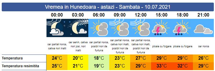 Duminică, vreme va fi schimbătoare. Soarele răsare la ora 05:47. Cerul va fi mai mult senin până în a doua jumătate a zile, când norii își vor face din nou prezența. Șansele de ploaie, în zonele joase sunt destul de reduse. Cu totul izolat, la munte e posibil să cadă unele averse, iar vântul va sufla cu unele intensificări. Soarele va apune la ora 21:20. Maxima zilei va urca spre 32 de grade.