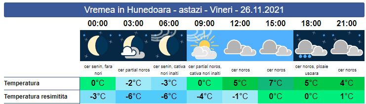Vineri, în zona noastră, temperaturile sunt specifice acestei perioade. Soarele răsare la ora 07:40. Ceața și norii vor domina întreaga zi, iar meteorologii anunță ploi locale. La munte precipitațiile vor fi mixte, iar la altitudini înalte se va depune zăpada. Vântul va sufla moderat cu intensificări în zonele de deal și munte. Soarele va apune la ora 16:50. Minimele zilei se vor încadra între -3 și 1 grad, iar maximele între 5 și 7 grade.