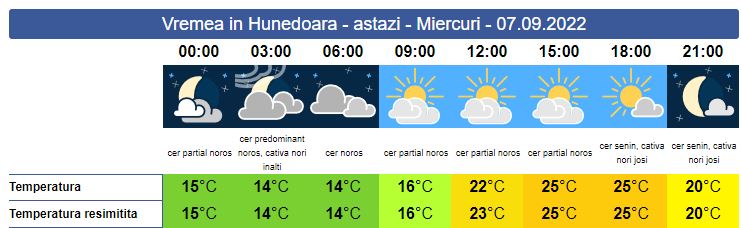 Miercuri, seria zilelor frumoase continuă. Soarele răsare la ora 06:57. În zona noastră probabilitatea căderi precipitaților este redusă, dar se vor înregistra perioade cu nori. Noaptea temperaturile scad, dar pe perioada diurnă vor continua să crească. Vântul va sufla slab și moderat. Maxima zilei va urca spre 25 de grade.