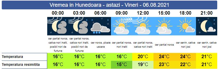 Vineri, vremea se răcește, Soarele răsare la ora 06:15. În această noapte cerul va fi mai mult noros cu șanse de ploaie spre sfârșitul intervalului. Izolat, dimineața în zonele depresionare e posibil să apară ceața. Peste zi, norii vor împărții cerul cu soarele, iar temperaturile se vor situa sub normalul perioadei. Vântul va avea unele intensificări mai ales în zonele înalte. Soarele va apune la ora 20:53. Valorile minime se vor situa în jurul valorii de 16 grade, iar maxima în jurul valorii de 24 de grade.