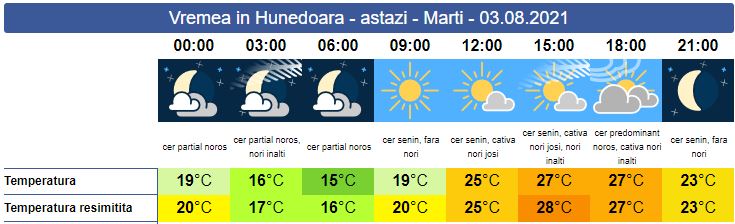 Marți, temperaturile sunt plăcute. Soarele va răsări la ora 06:11. În general cerul va fi mai mult senin, până spre seară. Peste noapte și dimineața, valorile termice vor fi cuprinse în jurul valorii de 15 grade. Cu totul izolat posibil să apără și unele averse însoțite de descărcări electrice. Vântul va sufla slab spre moderat, doar în zonele cu instabilitate va sufla cu unele intensificări. Soarele va apune la 20:57. Maximele zile se vor situa între 25 și 27 de grade.