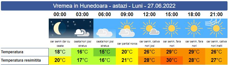 Luni, în zona noastră, vremea va fi în general frumoasă. Soarele va răsări la ora 05:38. În depresiuni, la prima oră a dimineții, va fi ceață. Cerul va fi variabil, iar temperaturile se vor resimți mai ridicate față de valorile din termometre. Local, în zonele înalte, există probabilitatea de instabilitate atmosferică specifică zilelor călduroase. Vântul va sufla slab și moderat cu unele intensificări, în perioada manifestărilor meteo nefavorabile. Soarele va apune la ora 21:24. Valorile maxime vor urca în jur de 29 de grade.