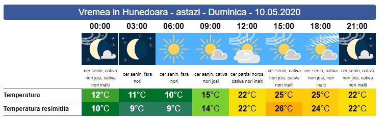 Duminică, vremea e în general frumoasă, doar câțiva nori vor umbri cerul predominant senin. Soarele răsare la ora 06:00. De dimineață, soarele e generos, iar temperaturile cresc simțitor. Vântul va bate slab spre moderat cu unele intesificări în zona montană înaltă. În cursul zilei cerul va deveni temporar noros, dar temperaturile vor ajunge peste valorile acestei perioade calendaristice. Soarele apune la ora 20:48. Temperaturile minime se vor situa între 10 și 15 grade, iar cele maxime între 22-25 de grade.