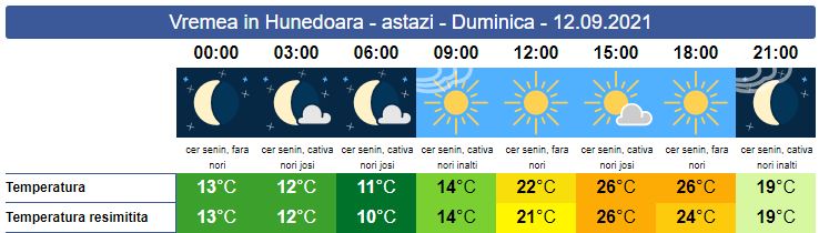 Duminică, temperaturile urcă simțitor. Soarele răsare la ora 07:00. Vremea frumoasă și caldă se va menține pentru acest sfârșit de săptămână. Vântul va sufla în general slab. Ceața v persista în dimineața în văii și depresiuni. Soarele va apune la ora 19:48. Minimele zilei se vor încadra între 11 și 14 grade, iar cele maxime în jurul valorii de 26 de grade.