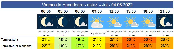 Joi, cerul va fi variabil spre senin. Soarele răsare la ora 06:12. Temperaturile cresc accentuat după amiaza zilei și se mențin până după aproape de apusul zilei care se va produce la ora 20:56. Vântul va sufla slab spre moderat. Valorile termice se vor încadra între 16 și 30 de grade, dar se vor resimți mai ridicate.