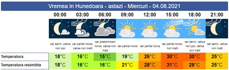 Miercuri, cerul va fi variabil. Soarele răsare la ora 06:12. Începând din această noapte norii vor împânzi cerul, iar peste zi vor fi perioade atât cu soare, dar și cu nori. Dimineața se menține răcoroasă, însă spre după-amiază se va instala disconfortul termic care va atinge pragul de 80 de unități. Vântul va sufla slab spre moderat cu unele intensificări mai ales în zonele montane. Soarele va apune la ora 20:56. Minimele zilei vor fi cuprinse între 15 și 19 grade, iar maxima va urca în jurul valorii de 30 de grade, la umbră.