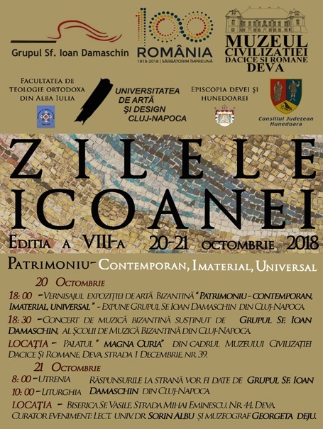 Muzeul Civilizaţiei Dacice şi Romane Deva, cu sprijinul Consiliului Județean Hunedoara, în colaborare cu Episcopia Devei și Hunedoarei, Universitatea de Artă și Design Cluj Napoca, Facultatea de Teologie Ortodoxă din Alba Iulia și Grupul Sfântul Ioan Damaschin din Cluj Napoca, vă invită să participați în zilele de 20 și 21 octombrie 2018 la cea de a VIII-a ediție a manifestării intitulate „ZILELE ICOANEI”.
