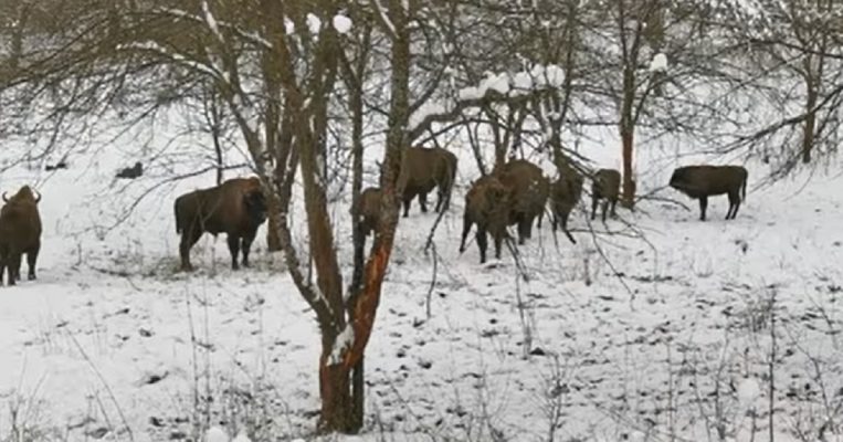 Zimbrii au ieșit la plimbare în pădurea Slivuț
