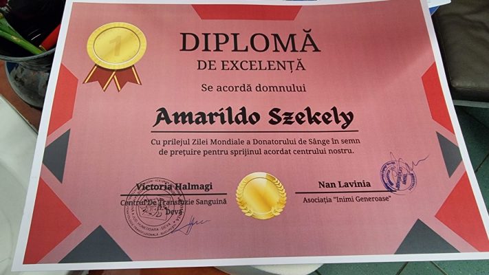 Îl felicit și pe ziaristul Amarildo Szekely care a fost astăzi premiat de către Centrul de Transfuzie Sanguină Deva pentru că a ajuns la 100 de donări de sânge.