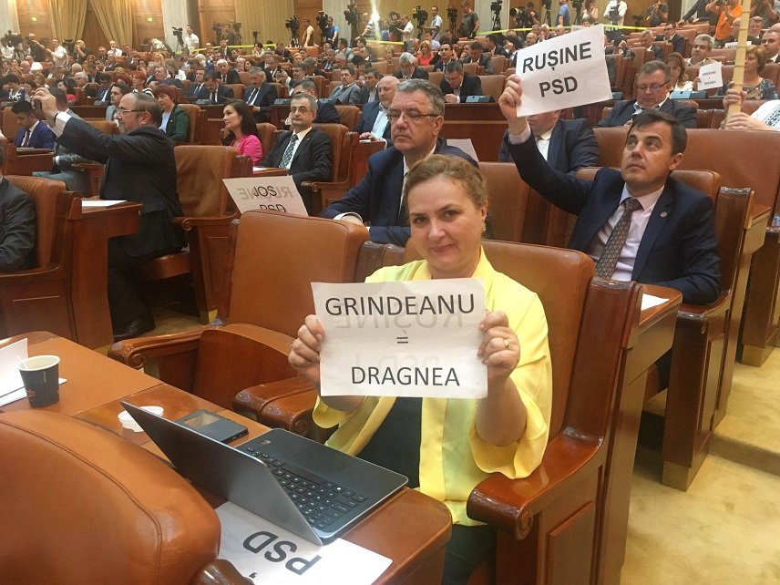 Parlamentarii opoziției protestează în cadrul ședinței în care se dezbate și se votează moțiunea de cenzură împotriva Guvernului Grindeanu.
