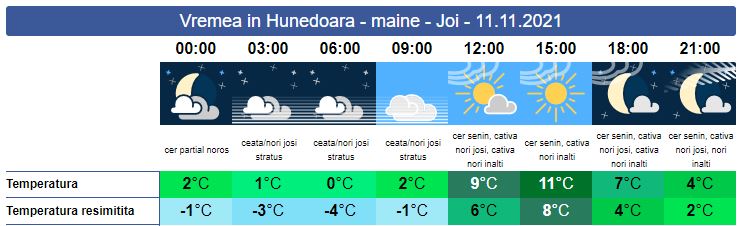Joi, ceața va fi persistentă. Soarele răsare la ora 07:20. Atmosfera va fi asemănătoare cu ziua precedentă. Temperaturile se mențin scăzute pe timpul nopții și în prima parte a dimineții. Cerul va fi acoperit de ceață, iar soarele va sta ascuns până spre amiaza zilei. A doua parte a zilei va fi, în general senină și se va încălzi ușor. Vântul va sufla slab spre moderat cu unele intensificări în zonele montane. Soarele va apune la ora 17:04. Minimele zilei se vor situa între 0 și 2 grade, dar se vor resimți cu minus, iar maxima zilei se va situa în jurul valorii de 11 grade.